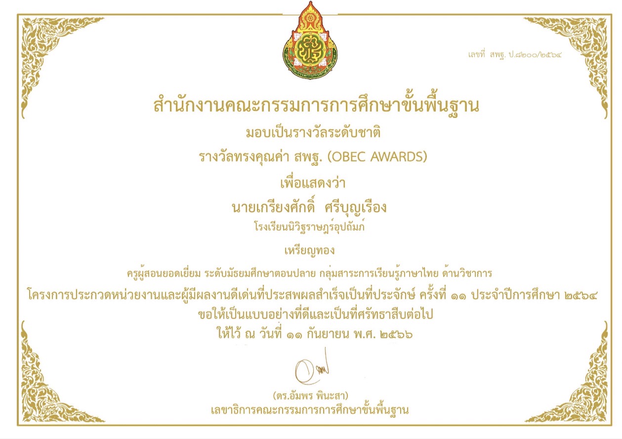 รางวัลเหรียญทอง ระดับชาติ รางวัลทรงคุณค่า สพฐ. (OBEC AWARDS) ครั้งที่ 11