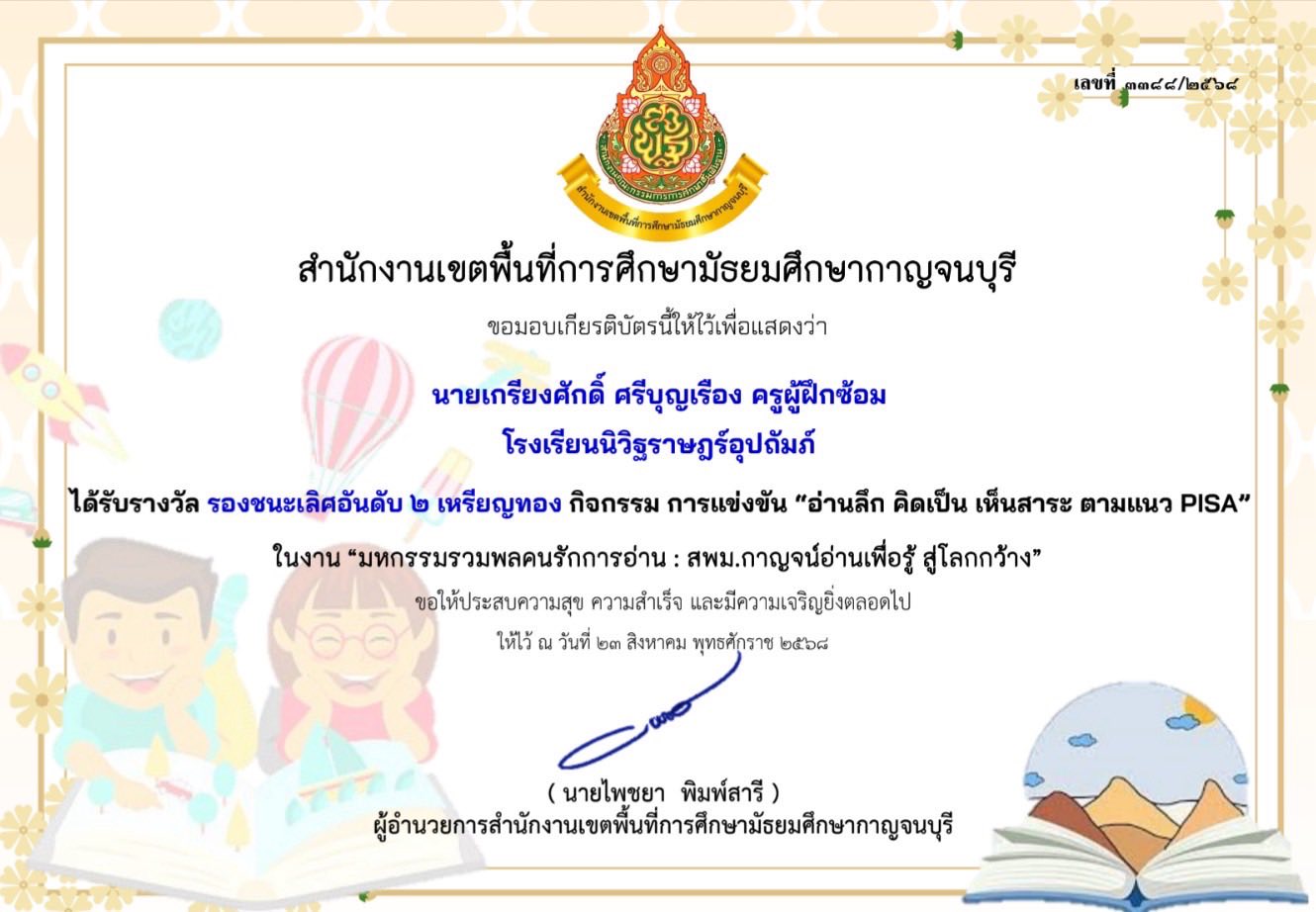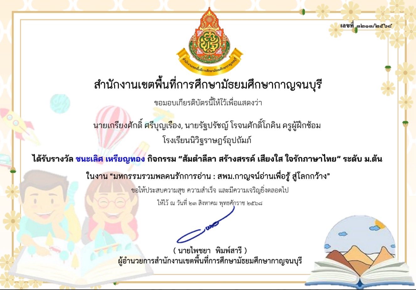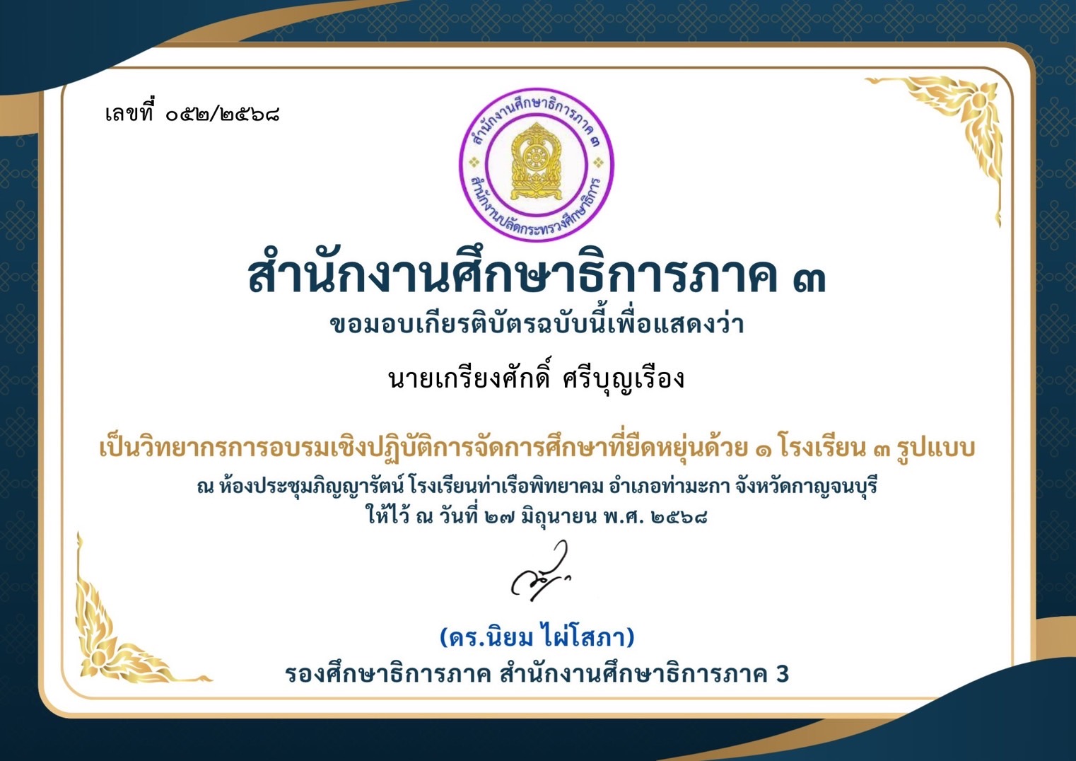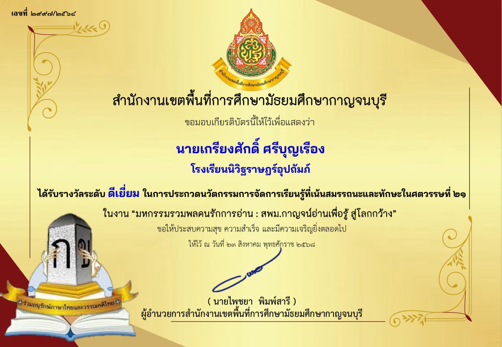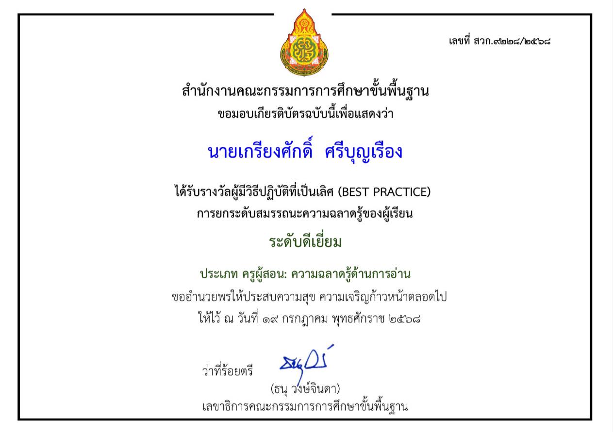 รางวัละดับดีเยี่ยม อันดับที่ 1 ผลงานการปฏิบัติที่เป็นเลิศ Best Practice ที่ประสบผลสำเร็จ ชื่อผลงาน การพัฒนาการจัดการเรียนรู้ Active Learning ร่วมกับการเรียนรู้แบบผสมผสานเพื่อส่งเสริมการเรียนรู้เรียนได้ทุกที่ ทุกเวลา |
